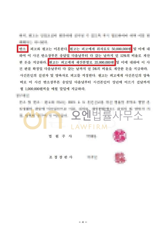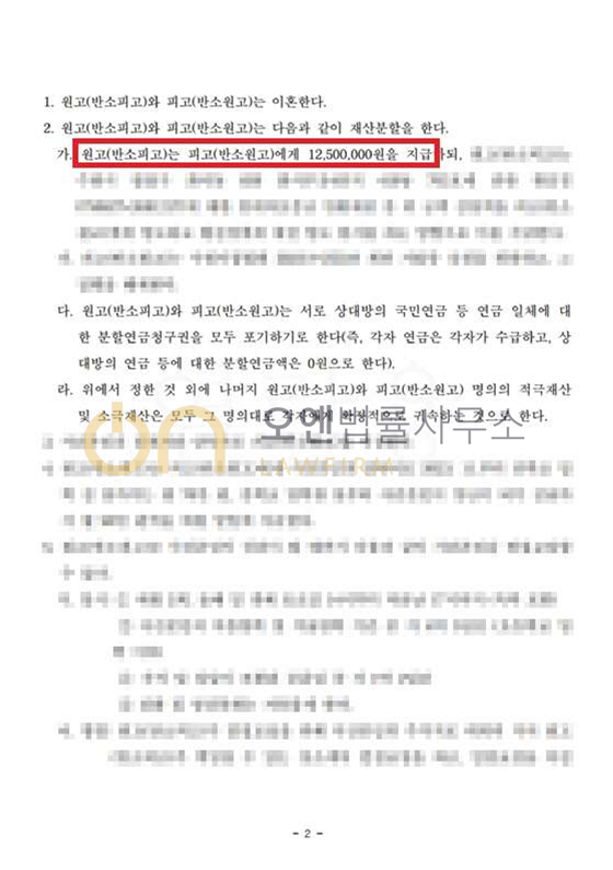 상대방이 청구한 위자료와 재산분할액의 1/8 수준에서 원만히 합의가 이루어졌고, 의뢰인은 많은 재산을 지킬 수 있었습니다.