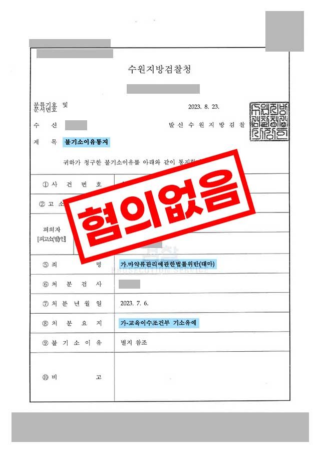 1건의 매수, 흡연 행위 만으로 사안이 축소되었고, 해당 건은 마약퇴치본부의 교육이수조건으로 기소유예 판결을 받을 수 있었습니다.