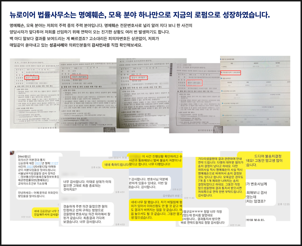 이런 분들을 위해 명예훼손 고소 대리 이례적으로 1,500만 원의 합의금까지 도출해낸 로펌으로서