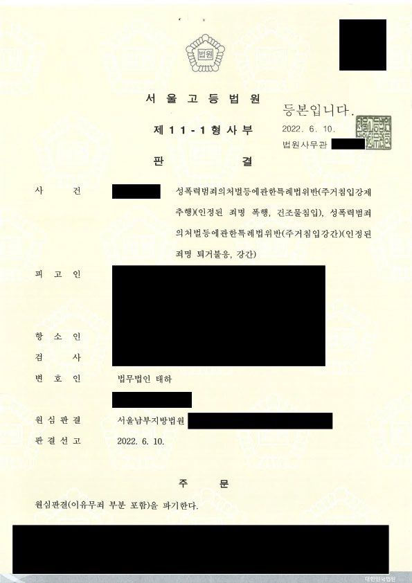 판사는 원심에서 변호인의 주장을 받아들여 각 주거침입, 폭행, 퇴거불응, 강간에 관하여 유죄를 인정하면서 징역 2년 6월을 선고하였습니다. 항소심을 진행하는 과정에서 피해자 전원과 합의에 이를 수 있었고, 그 외 의뢰인의 가족의 사정 등을 양형에 유리한 자료로 제출하였고, 항소심 재판 결과 집행유예가 선고되어 석방될 수 있었습니다.