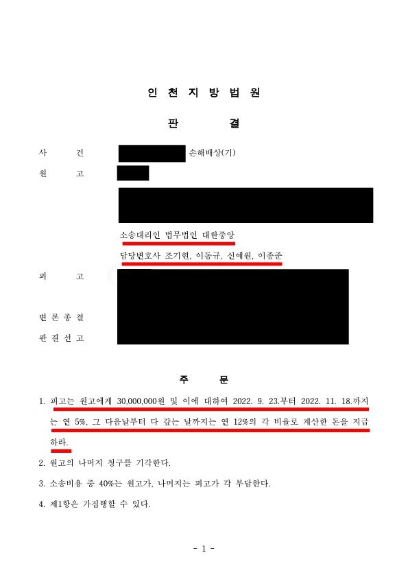 재판부는 이동규변호사의 주장을 받아들여 피고에게 의뢰인을 상대로 3,000만원의 손해를 배상할 것을 결정하였습니다. 이후 기일에 따라 배상이 모두 이루어지지 않으면 12% 이자도 지급할 것을 동시에 명하였습니다.