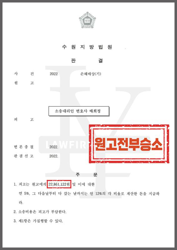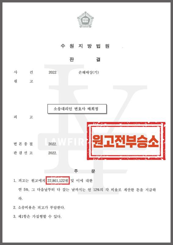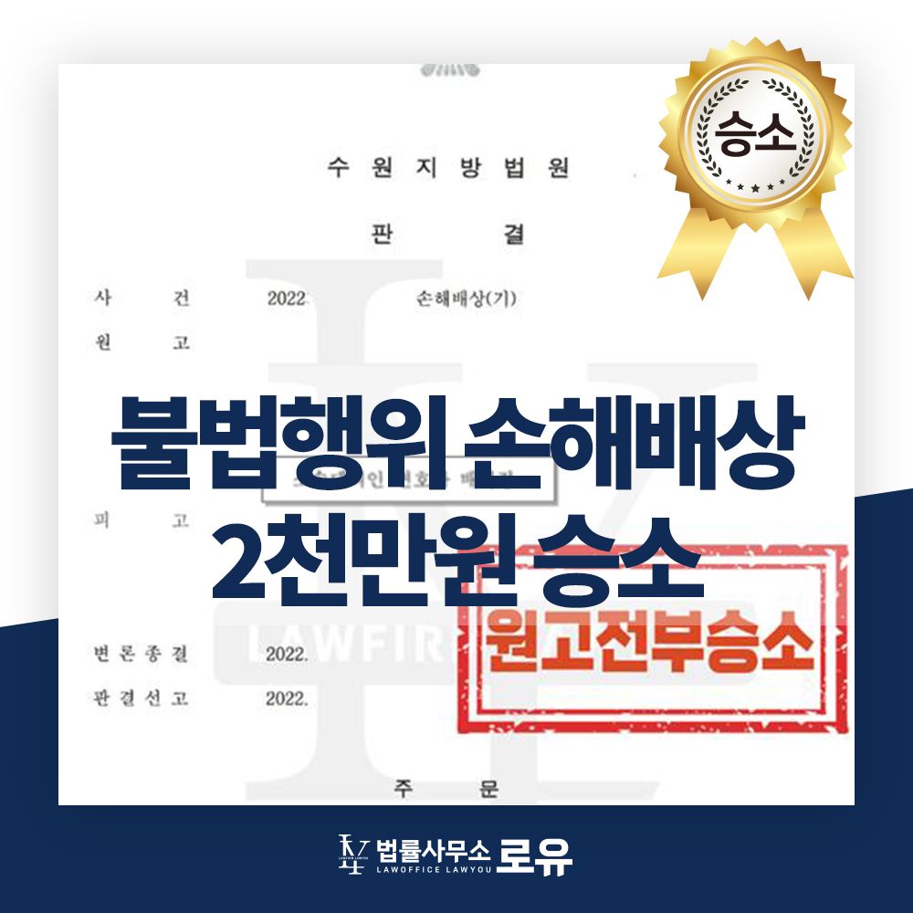 법률사무소 로유의 적극적인 조력으로 의뢰인에게 발생된 손해를 모두 인정 받고 불법행위 손해배상 소송 2천만원 승소 판결을 받을 수 있었습니다.
