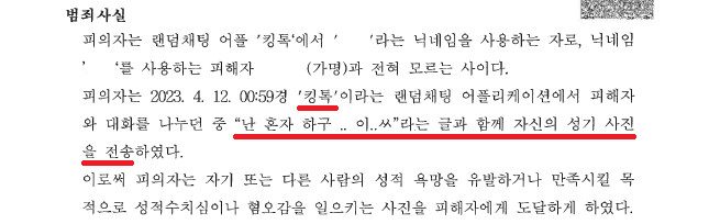 A씨는 2023. 4. 12. 00:59경 랜덤 채팅 어플리케이션 '킹톡'에서 전혀 모르는 여성 B씨와 대화하던 중 다짜고짜 "난 혼자 하구.. 이..ㅆ"라는 채팅을 전송하고는 성기 사진을 전송하였습니다.