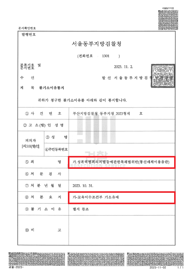 ⑥ '킹톡'의 특성, 랜덤 채팅 어플리케이션에서의 헌터의 유행과 문제점, 그리고 제가 맡은 헌터 사건들 중 무혐의로 마무리한 사건들의 불송치결정서와 불기소이유통지서, 무죄로 마무리한 사건들의 판결문 등을 정리하면서 '킹톡'에서의 성적 채팅과 사진 전송은 통신매체이용음란죄가 인정되어서는 안 되지만, 가사 견해를 달리하여 인정된다고 보더라도 적어도 양형으로 매우 유리하게는 참작되어야 하고 A씨 역시 선처를 받는다면 교육에 성실히 임할 것을 다짐하고 있으므로, 기계적으로 형사조정에 회부하지 말고 '기소유예' 처분을 해달라는 내용의 변호인의견서를 추가로 작성하여 제출하였습니다.