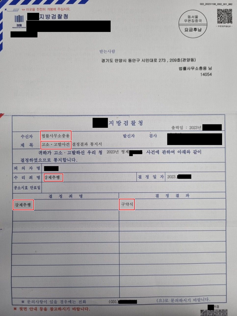 의뢰인이 원하는 강제추행합의금을 수령함은 물론이고, 이 사건 강제추행고소 또한 인정되면서 상대방은 검찰로부터 구약식 벌금형 처분을 받게 되었습니다.