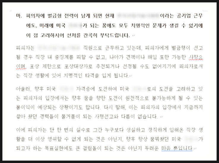 참고를 위해 저희가 선처를 이끄는 방향으로 작성한 변호인 의견서 샘플을 아래 공유해 드리겠습니다.