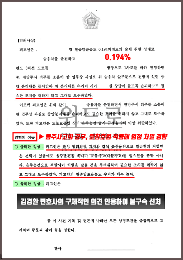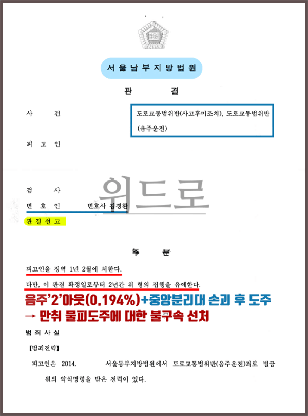 -> 김경환 교통범죄전담 검사출신변호사의 조력으로 불구속 선처. 참고로, 윤창호법에 의해 단순 음주2아웃만으로도 가중처벌대상인데, 물피사고도주, 만취운전까지하는 것은 실형사안에 가깝습니다.