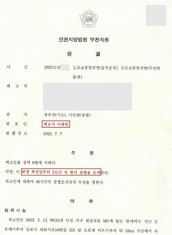 [ 형사 성공사례 ] 음주운전 3회, 무면허 4회 집행유예