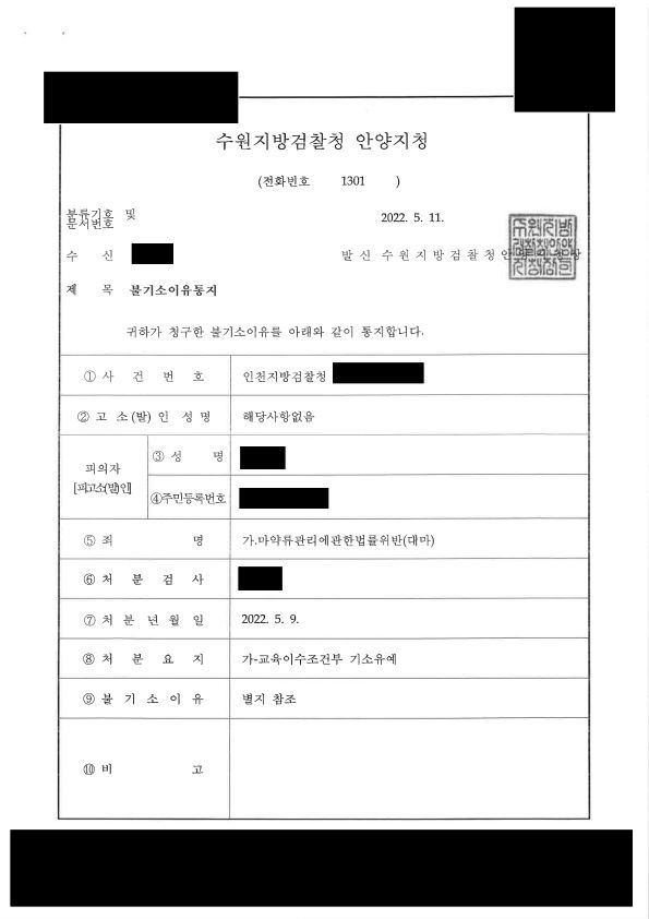 담당검사는 변호인의 주장 및 제출한 양형자료를 참작하여 의뢰인에 대하여 교육이수 조건부 기소유예 처분을 하였습니다.