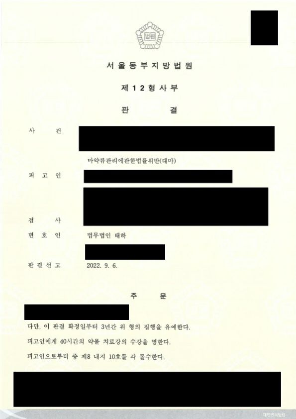 본건에 있어 가장 중요한 정상은 의뢰인의 단약의지였던바, 다량의 자료 확보를 위하여 선고기일을 넉넉히 잡고 최대한 많은 시간을 확보하여 한국마약퇴치운동본부 중독재활센터에서의 상담, 프로그램 참여 등 의뢰인의 유리한 정상을 적극적으로 피력하였습니다.