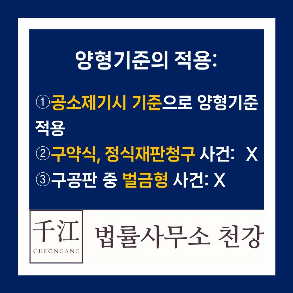 한편, 양형기준은 구약식 또는 정식재판청구 사건에는 적용하지 않고 공판절차회부 사건에만 적용합니다. 또한, 구공판 사건 이라도 벌금형을 선택한 경우에는 양형기준이 적용되지 아니합니다. 양형기준이 벌금형에 관한 기준을 별개로 또는 징역형과 병행하여 제시하거나, 벌금형 선택을 금지하는 명시적인 지침을 설정하지 않는 한 벌금형을 선택할 수 있고, 그 경우에는 양형기준이 적용되지 않게 되는 것입니다.