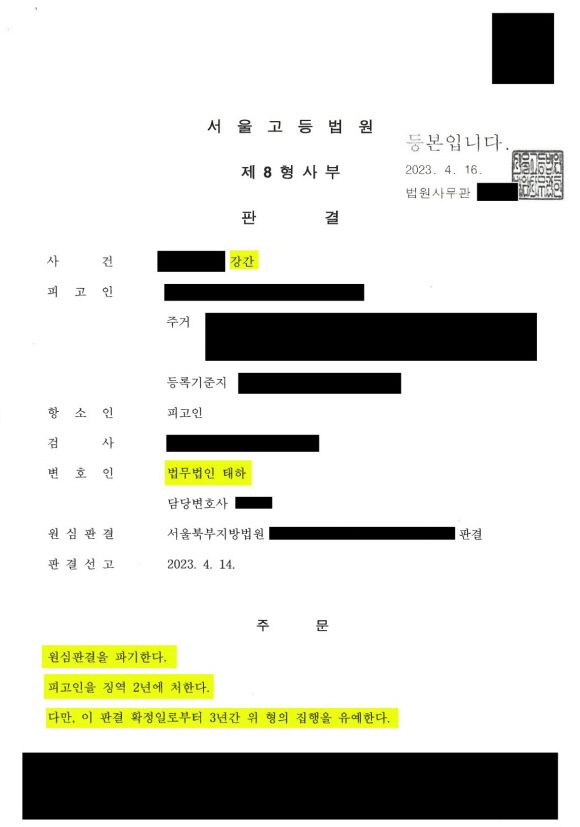 1심에서 징역 2년의 실형을 선고받아 법정 구속이 되자, 뒤늦게 이 사건을 알게 된 가족들이 법무법인 태하를 찾아왔습니다. 의뢰인은 초기 수사단계에서는 혐의를 부인하였으나, 피해자가 제출한 증거자료들과 주변인들의 진술로 인해 결국 자신의 혐의를 인정할 수밖에 없었습니다. 그러나 사건의 심각성을 알지 못한 채 변호사를 선임하지 않은 채 안일하게 대응하였고, 결국 1심에서 실형을 선고받게 되었습니다.