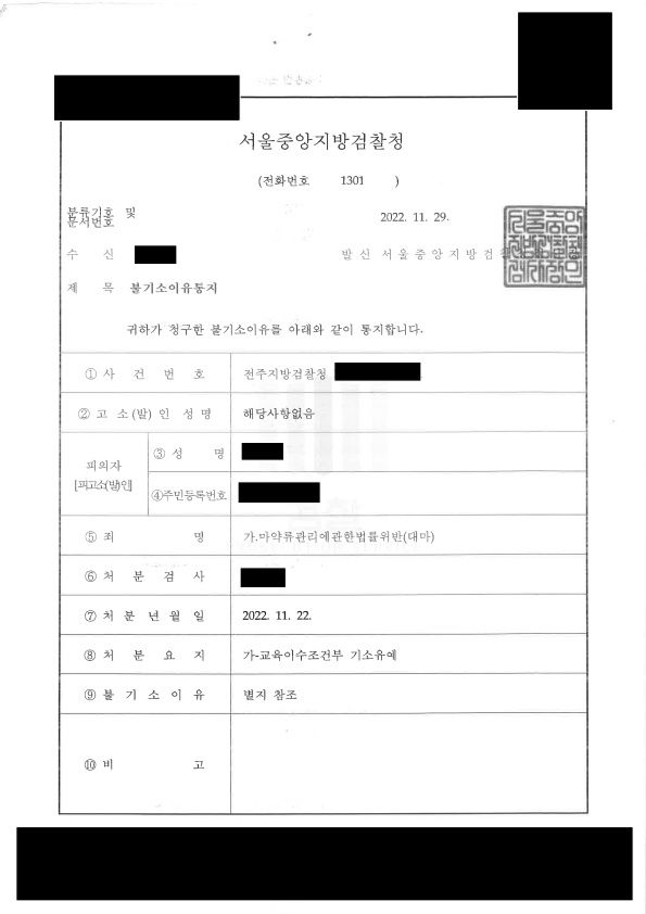 수사기관은 변호인의 주장 및 의뢰인의 사정을 고려하여 선처해주었고, 마약퇴치운동본부의 교육을 받는 조건으로 기소유예 처분을 하였습니다.