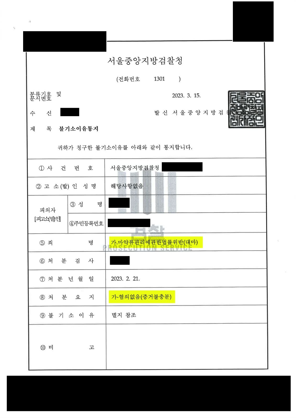 의뢰인은 자신의 전 남자친구였던 자가 자신과 상의 없이 자신에게 대마 성분이 포함된 젤리를 보냈던 것이며, 자신은 대마를 흡연한 것이 아니라 정신건강의학과에서 처방 받아 복용하고 있는 약으로 인해 가짜 양성반응이 나온 것이라고 하는 등의 전략적인 변호인 의견서를 구성하여 혐의없음(증거불충분) 처분을 받을 수 있었습니다.