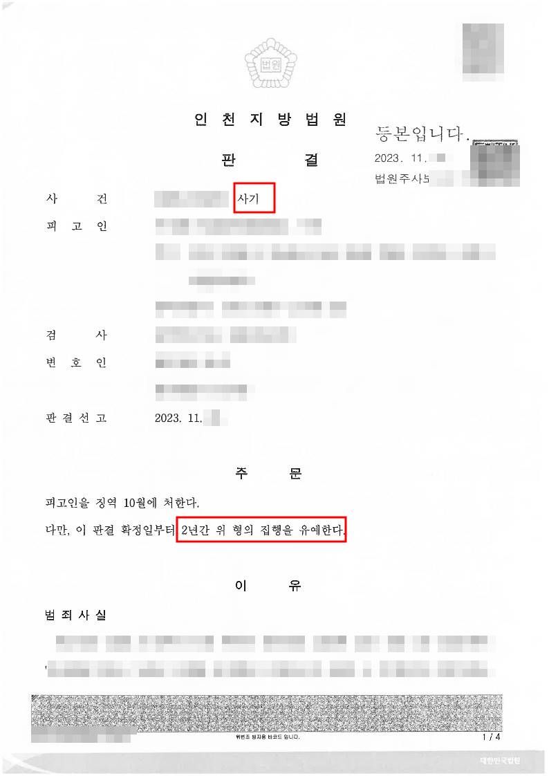 제347조(사기) ①사람을 기망하여 재물의 교부를 받거나 재산상의 이익을 취득한 자는 10년 이하의 징역 또는 2천만원 이하의 벌금에 처한다.