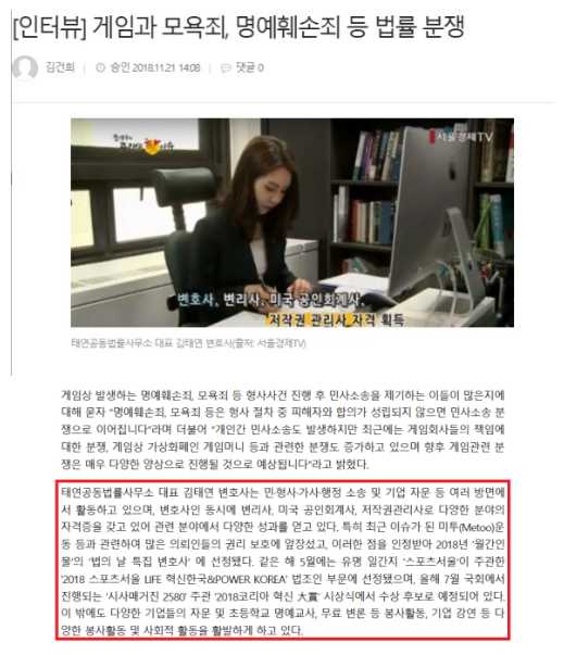 저희 태연법률사무소 모욕죄전문변호사 김태연 대표변호사님께서는 약300회 이상의 언론인터뷰를 진행하셨으며 법률방송에서 생방송으로 법률상담을 진행하신 경험이 많은 능력있는 미녀변호사님입니다.