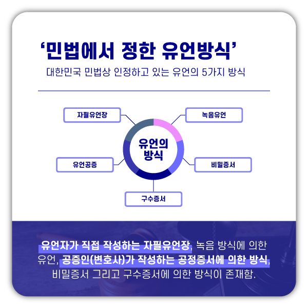 부모님(피상속인)이 생전에 유언을 남길 수 있는 방법으로는 민법에서 5가지의 방식을 규정하고 있는데 【자필증서유언·녹음유언·공정증서유언·비밀증서유언·구수증서유언】이 그 유언의 방식입니다.