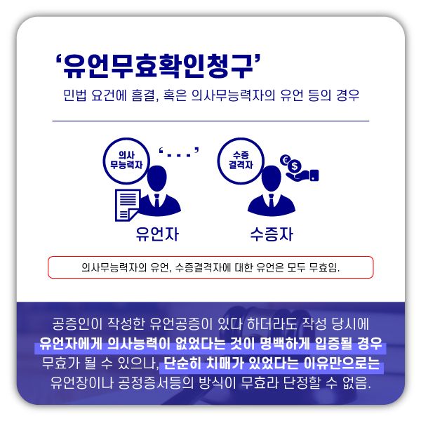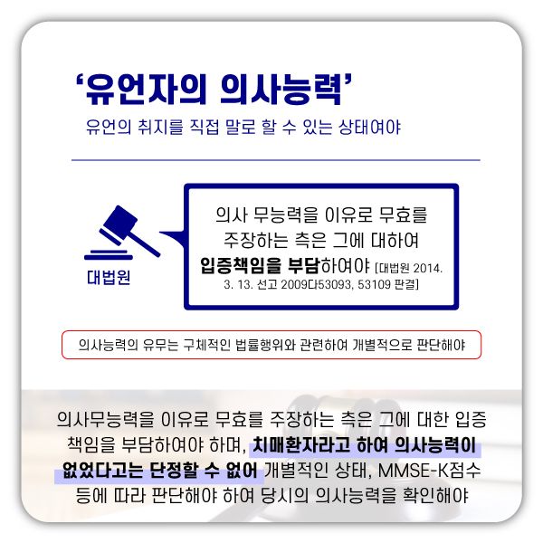 ※ 실제 재판상에서는 유언자가 유언을 할 당시에 의사능력이 있었는지 입증이 필요한데, 단순 주장만 존재하고 이러한 입증의 자료가 부족할 경우에는 단순히 치매상태에 있었다는 이유만으로는 유언장, 유언공증의 방식이 무효라고 쉽게 단정할 수는 없습니다.
