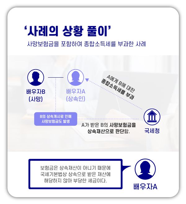 이후 같은 해 9월에 B씨에 대한 세무조사를 재개하여 상속인인 A씨가 받은 B씨의 ‘사망보험금’ 4억 7,000만 원을 상속재산으로 보고, 이 상속재산에 대한 피상속인의 종합소득세를 상속인 A씨에게 부과하였습니다.