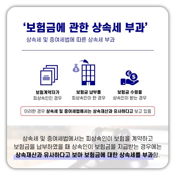 현재 ‘상속세 및 증여세법’에서는 ‘피상속인이 보험계약자인 보험계약에 의해 받는 보험금은 상속재산으로 본다’고 규정하고 있기 때문에 피상속인이 보험료를 내고, 상속인이 보험금을 지급받는 경우 상속재산과 유사하다고 보고 그 사망보험금은 상속세 과세 대상으로 보고 상속세를 부과하고 있습니다.