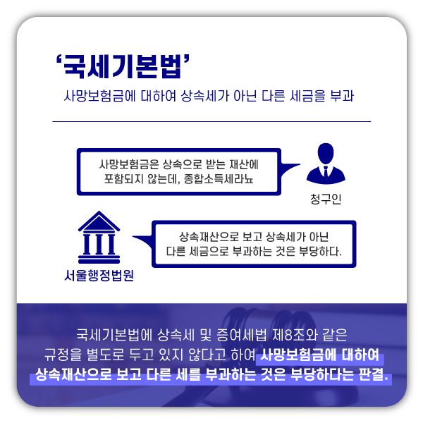 다시 말해 국세기본법에는 상속세와 같은 규정을 별도로 두고 있지 않다는 이유로 사망보험금에 대하여 상속재산으로 보아 상속세가 아닌 다른 세금(ex. 종합소득세)을 부과하는 것은 부당하다고 판결한 것입니다.