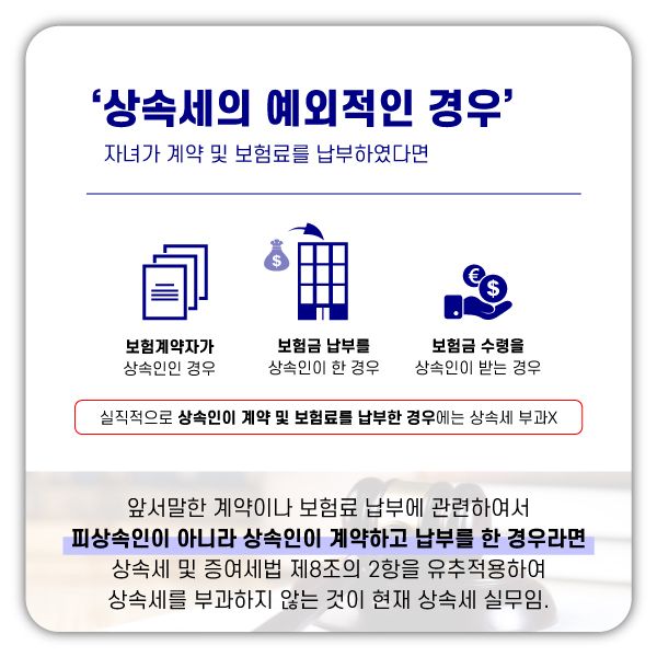 피상속인이 보험계약을 체결 및 보험금을 납부하였고, 수익자로 지정된 해당 상속인이 보험금을 취득하게 되는 것은 수익자로 지정된 상속인이 노력하여 얻은 재산이 아니므로 『사실상 상속재산과 다름없다는 취지에서 ‘상속세 및 증여세법’에서는 이를 상속재산으로 보고 상속세를 부과』하고 있습니다.