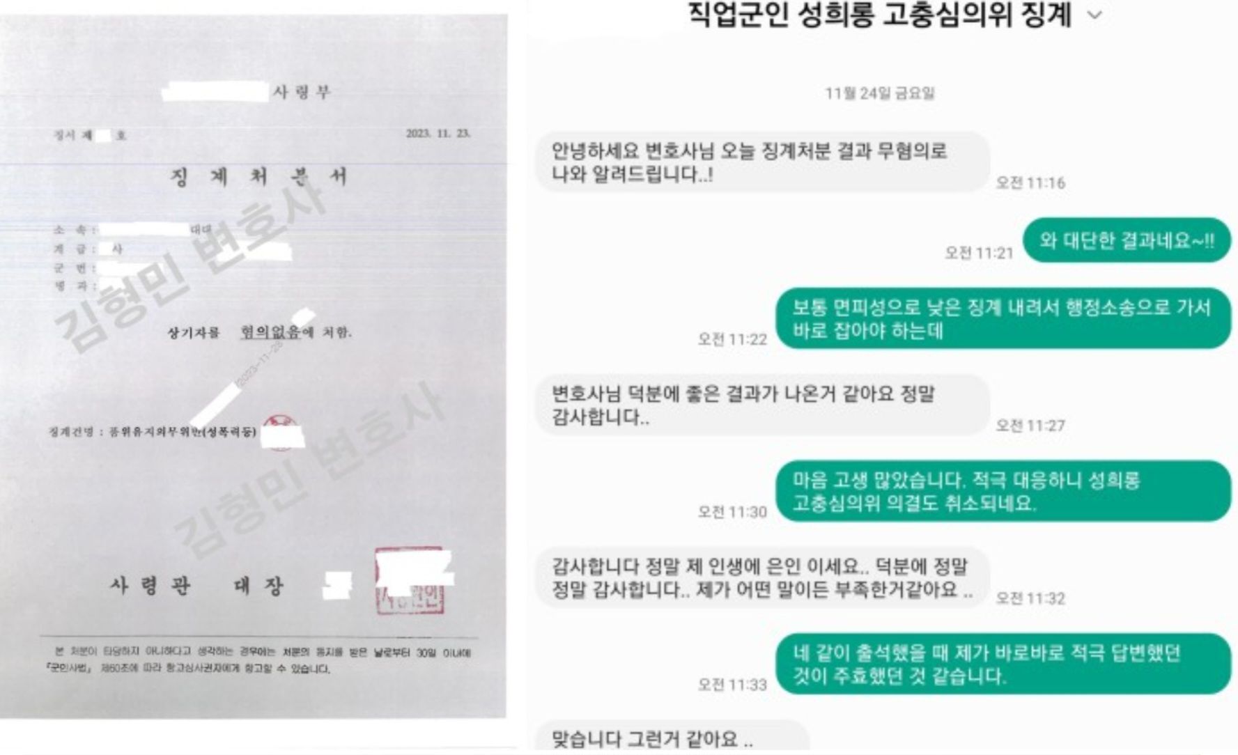 군부대에서 이루어진 군검사님의 조사에 입회를 하였고 이후 이루어진 징계위원회 출석 역시 의뢰인과 같이 하여 저 역시 매우 적극적으로 진술을 하였습니다. 5차례의 신고 내용 중 1차례에 대해서만 구체적인 일시의 특정이 있고 당시 의뢰인이 어떻게 말했다는 주장이 있는데 방어권 보장 측면에서도 최소한 초순, 중순, 하순 또는 첫째주, 둘째주 정도의 구체적인 진술은 있는 것이 타당하다는 점, 실제 5번의 행위가 있었다면 기계가 아닌 이상 5번 모두 녹음기를 틀 듯이 동일한 말을 하였을 리는 없다는 점, 성적 수치심이라는 것은 내심의 영역에 속하는 것으로서 당사자 본인만이 아는 것이기는 하나 동일하게 내심의 영역에 속하는 고의도 판례는 "행위자의 진술에 의존하지 아니하고 외부에 나타난 행위의 형태와 행위의 상황 등 구체적인 사정을 기초로 하여 일반인이라면 당해 범죄사실이 발생할 가능성을 어떻게 평가할 것인가를 고려하면서 행위자의 입장에서 그 심리상태를 추인하여야"한다는 입장인데 단순히 성적 수치심을 느꼈다는 말만으로 성적 수치심을 느꼈다고 단정해서는 안 되고 외부로 드러난 행위 형태와 전후 상황 등을 종합 고려해서 성적 수치심을 느낄 만한 상황이었는지 판단하여야 한다는 점, 추가적으로 무고의 동기로 추정되는 사연 등을 언급하였는데 모든 심의위원님들이 돌아가면서 다수의 질문이 있었고 상당히 장시간 위원회 심의가 이어졌습니다. 마지막으로 그렇게 억울하다면 무고 고소 등의 조치는 없었는지 물어보았는데 제가 요즘 군대 내에서 성희롱, 성추행으로 신고가 이루어지면 계급의 고하를 막론하고 신고를 당한 사람이 약자이고, 아닌 것 같다는 판단이 들어도 면피성으로 낮은 징계로 마무리 되는 경우가 많은데 제가 무고나 명예훼손 고소대리를 수임하면서 추가적인 변호사비를 받는 것은 변호사로서 부담되는 점이 있어 제가 일단 만류하였다는 말을 하였습니다. 나오면서는 예상 외로 징계가 취소되고 혐의없음 결정이 나올 수도 있겠다는 말을 하였는데 제 짐작대로 좋은 결과가 나왔습니다. 제가 전화를 하였는데 의뢰인이 말을 잇지 못하고 계속 울어서 저는 기쁘면서도 마음이 많이 아팠습니다.