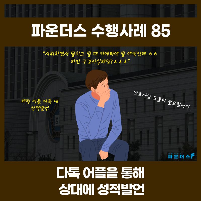 다톡 어플 내에서 상대와 채팅을 하던 중 “샤워하면서 딸치고 쌀 때 카메라에 쌀 예정인데 ㅎㅎ 라인으로 구경하실래영?ㅎㅎㅎ”과 같은 발언을 하여 통신매체이용음란 혐의로 고소를 당하여 수사에 이르게 되었습니다. 처음 겪는 성범죄 수사에 걱정이 된 의뢰인은 파운더스 변호인의 조력하였고 변호인은 수사 방향성을 잡기 위해 의뢰인이 해당 발언에 이르게 된 경위 등을 파악해 가기 시작하였습니다.