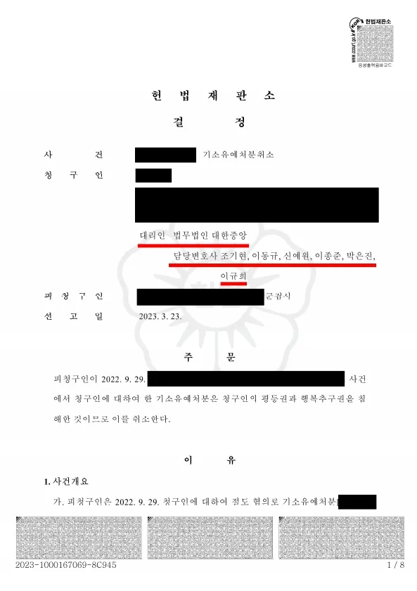 이동규변호사는 기소유예 처분을 받은 이상 행정소송보다는 헌법소원이 의뢰인에게 가장 이익이 큰 절차라고 판단하고 기소유예취소 헌법소원을 진행하기로 하였습니다.