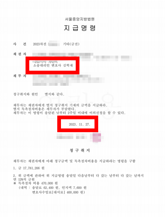 이러한 독족절차를 살펴보면, 채권자가 법원에 지급명령일 신청합니다. 재판부는 채무자에 대하여 지급명령결정을 합니다. 채무자에게 송달합니다. 송달받은 날부터 2주일 내에 채무자가 이의신청을 하지 아니하면, 확정된 지급명령을 집행권원으로 활용할 수 있습니다. 채권자는 원칙적으로 집행문을 부여 받을 필요 없이 지급명령 정본에 의하여 강제집행을 합니다.(민사집행법 제58조 제1항)