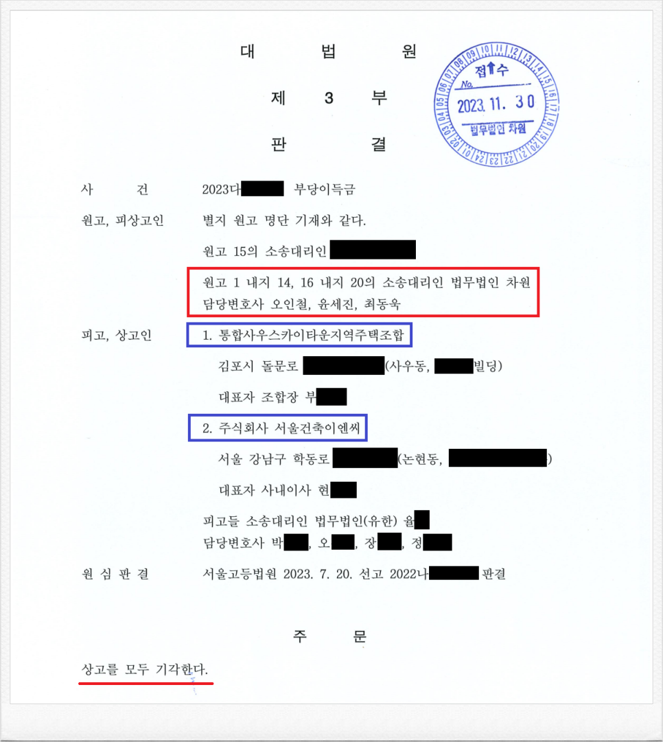 이번에도 재판부는 저의 주장을 받아들여, 통합사우스카이타운 지역주택조합 측의 상고를 기각하였고, 결국 지역주택조합 분담금 반환 소송 대법원 최종 승소 판결을 이끌어 내었습니다.