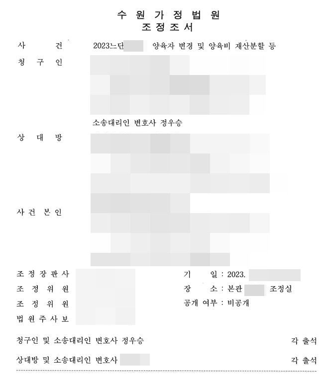 2시간 넘게 걸린 조정 절차에서 최종적으로 우리 측 의견이 받아드려져, 양육권을 의뢰인에게 변경하고 양육비 120만원을 받을 수 있었으며, 재산분할도 본인의 몫에 맞는 비율로 받을 수 있었습니다.(재산분할 주문은 개인정보상 생략함)