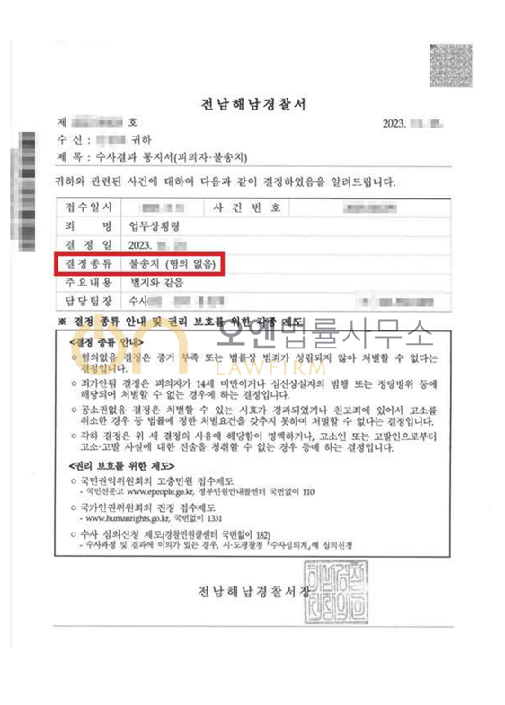 수사기관은 변호인의 주장을 받아들여 불송치 결정(혐의 없음)을 내렸습니다.