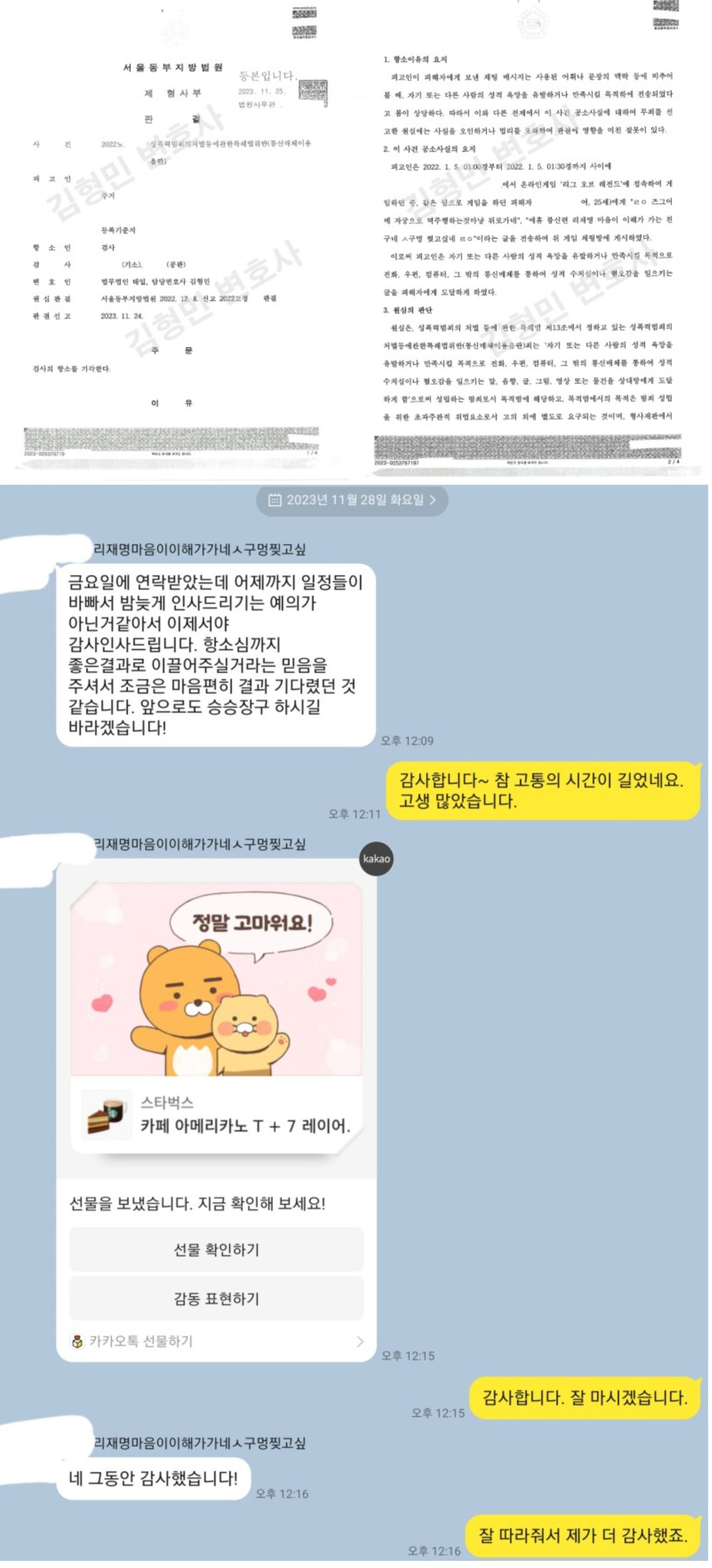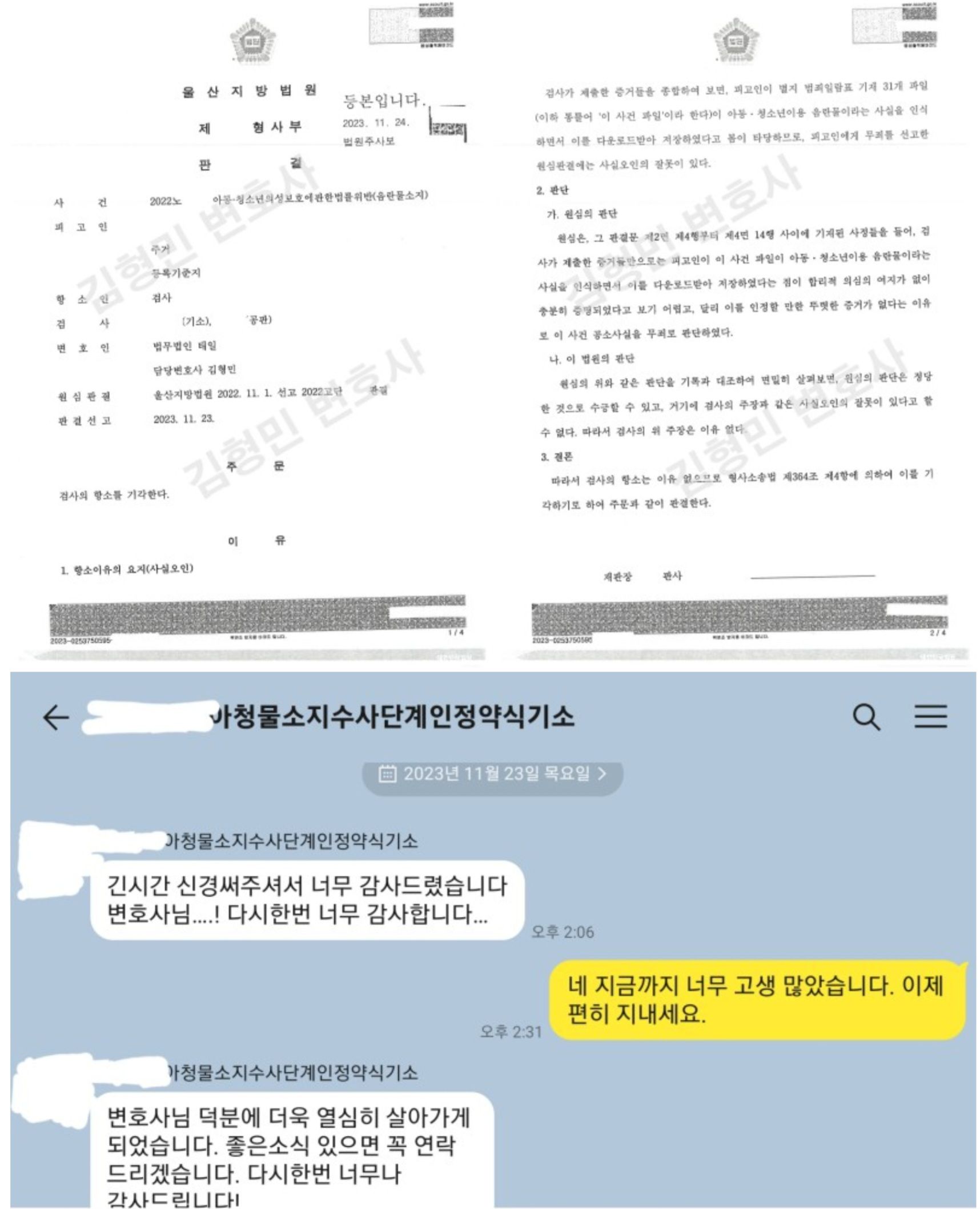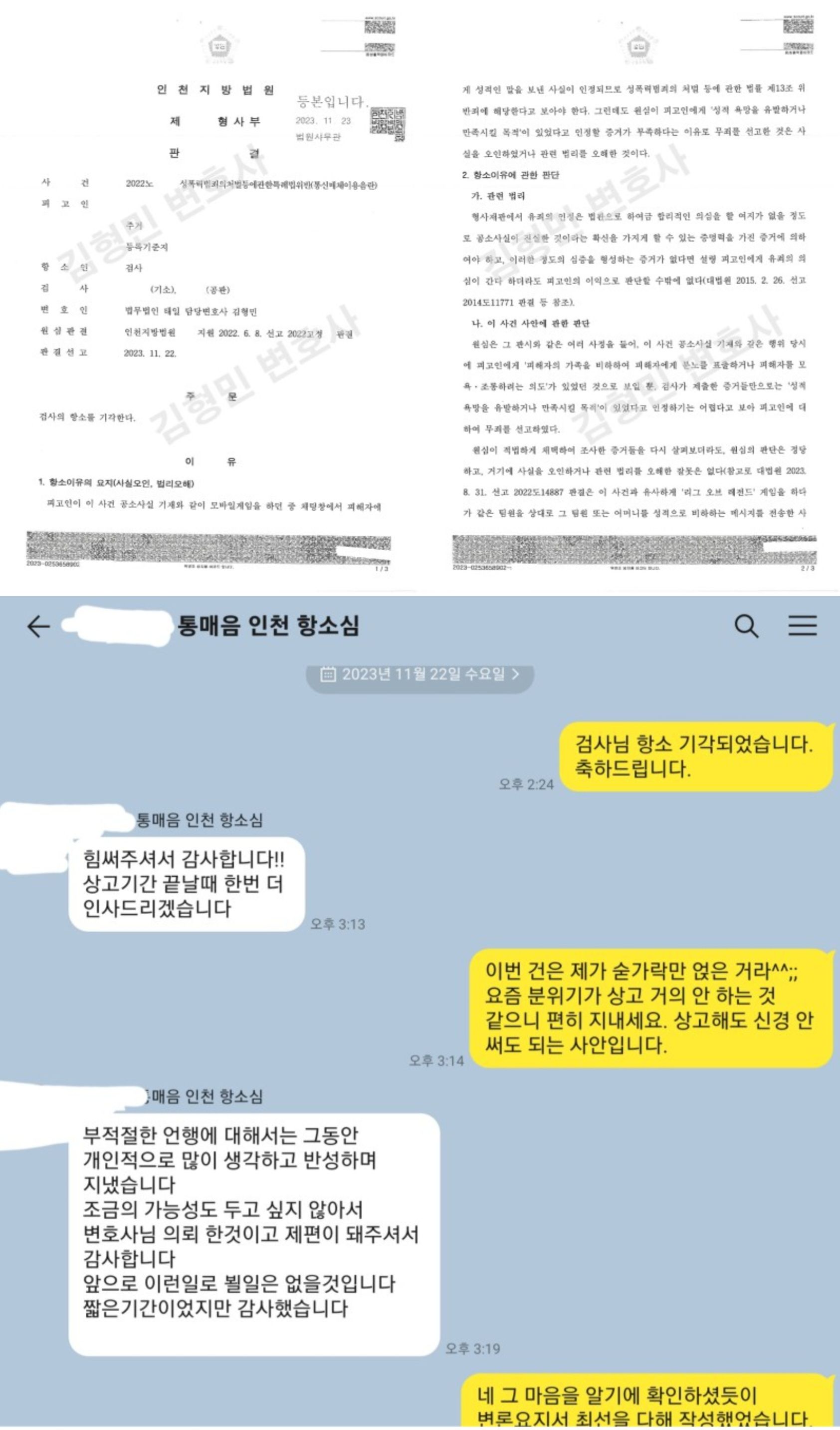 이 의뢰인과는 통매음 초창기부터 같이 어려움을 겪으면서도 의뢰인도 저에 대한 신뢰를 놓지 않았고 저 역시 더욱 힘을 내어 최선을 다했던 것 같습니다. 당시 제가 거의 대부분 통매음으로 무혐의로 종결을 시키는 상황이었는데 이 사안은 약식기소가 되었습니다. 인터넷 상에서 일단 약식기소가 되면 우리나라에서 무죄 비율이 매우 낮다는 말도 있었고, 김형민도 무혐의를 못 받는 사안이면 그냥 합의하고 선고유예 방향으로 가는 것이 맞지 않느냐는 말도 있었던 것 같습니다. 1심 재판 과정에서도 어려움이 있었지만 의뢰인의 믿음이 조금도 흔들리지 않아 더욱 힘을 내서 최선을 다할 수 있었는데 그런 면에서 제가 오히려 고마운 마음이 들기도 합니다.