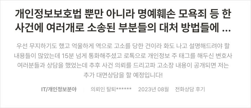 억울하게 고소를 당하신 의뢰인분을 도와 개인정보보호법 위반 무혐의로 사건을 안전하게 마무리해 드릴 수 있었다고 생각합니다.