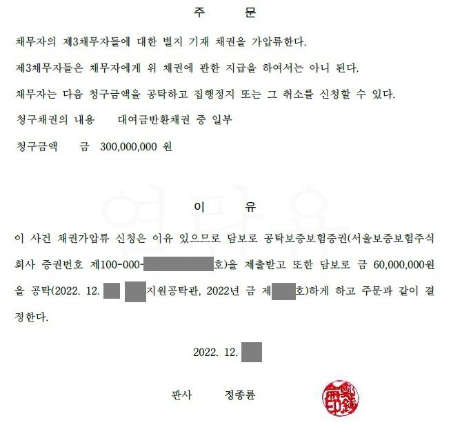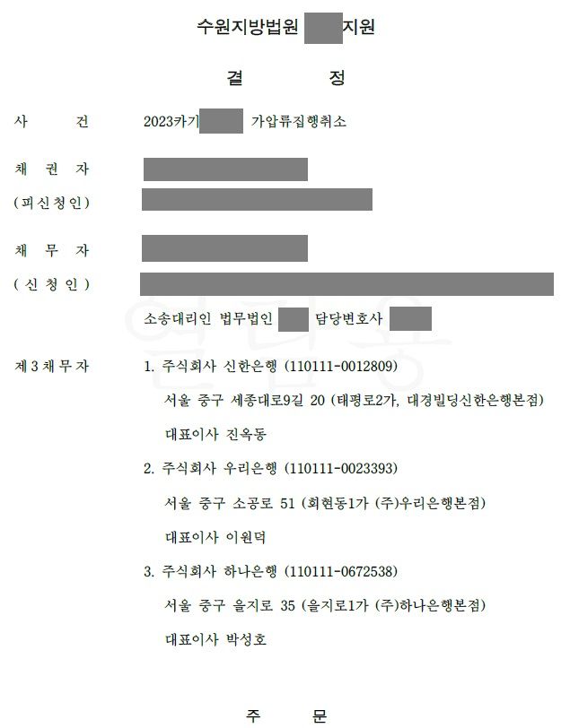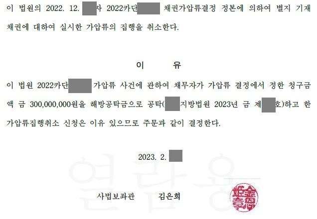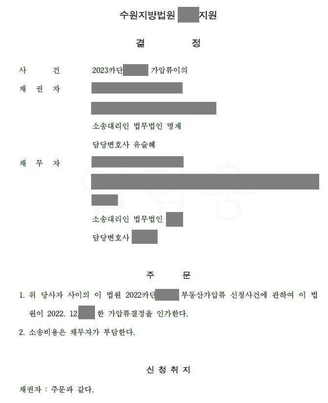 채무자의 가압류 이의에도 불구하고 가압류결정은 법원에서 인가되었고, 의뢰인이 지출한 가압류 이의 관련 소송비용마저 채무자인 사업상 파트너가 부담하는 것으로 정리되었습니다. 결국 채무자는 가압류 청구금액 전액을 법원에 변제공탁하고 나서야 가압류 집행을 취소시킬 수 있었고, 의뢰인은 적은 비용으로 생각보다 빠르게 미수채권을 회수할 수 있었습니다.