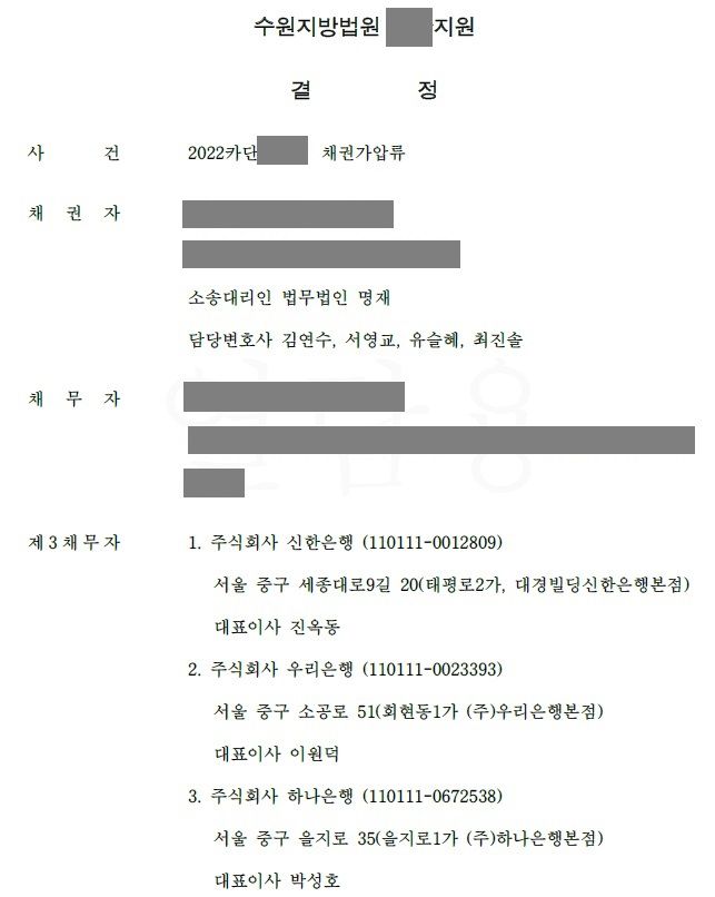 의뢰인은 장기간에 걸쳐 고액의 금전거래를 해온 사업상 파트너가 차일피일 대금 지급을 미루자, 결국 저에게 법적인 조치를 의뢰하게 되었습니다. 민사소송의 경우 소제기 시점으로부터 판결 선고까지 길게는 1년 이상이 걸리기도 하고, 승소한다 하더라도 집행이 어려워지는 경우가 많기 때문에, 초기부터 가압류를 적극적으로 활용하기로 하고 전략적으로 청구금액 중 일부만으로 채권가압류를 진행하였습니다.