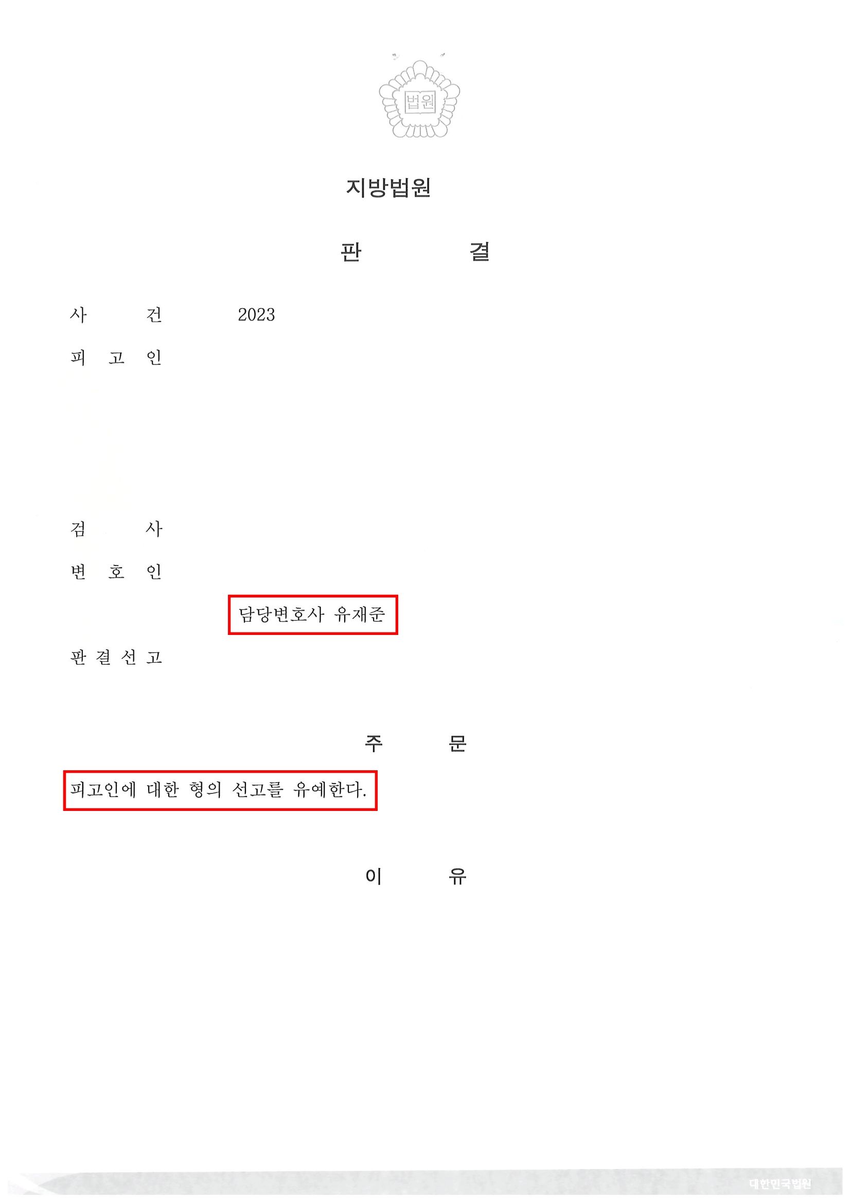 변호인은 피해아동의 상처가 법률상 상해로 볼 수 없는 점, 어린이집 선생님에게 불가항력적인 상황인 점 등을 주장하였고, 이에 재판부께서는 의뢰인의 업무상과실치상 혐의에 대하여 선고유예 판결을 내려주셨습니다.