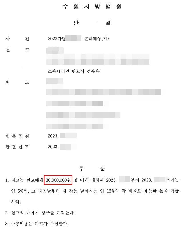3천만원이 전부 인용되는 경우가 흔치 않아 걱정 많았지만 목표한대로 3천만원이 전부 인용되었고, 소송비용까지 상대방이 부담하게 되어 의뢰인 분께서는 저희 변호사 선임료까지 상대방 측으로부터 받게 되는 대성공을 이루어 내었습니다.