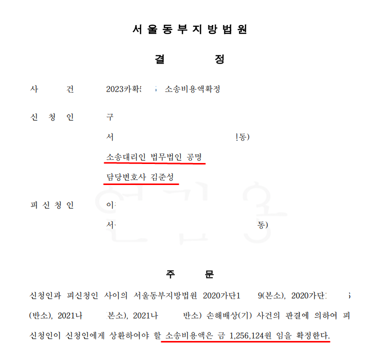 서울동부지방법원은 김준성 변호사의 위 주장을 받아들여 소송비용액확정 결정을 하였습니다.