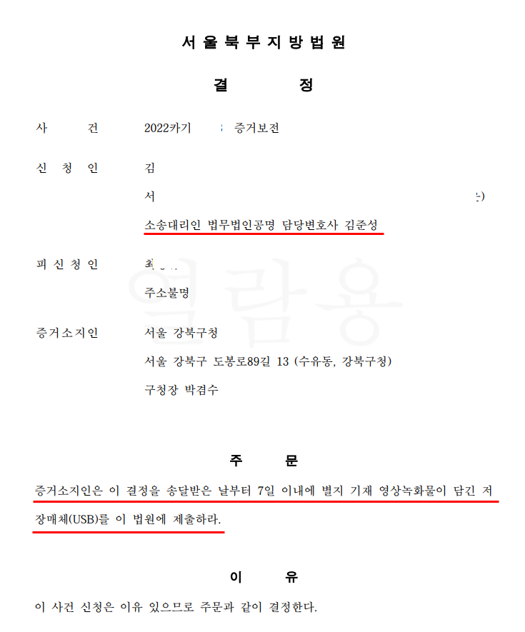서울북부지방법원은 김준성 변호사의 위 주장을 받아들여 증거보전 신청을 인용하였습니다.