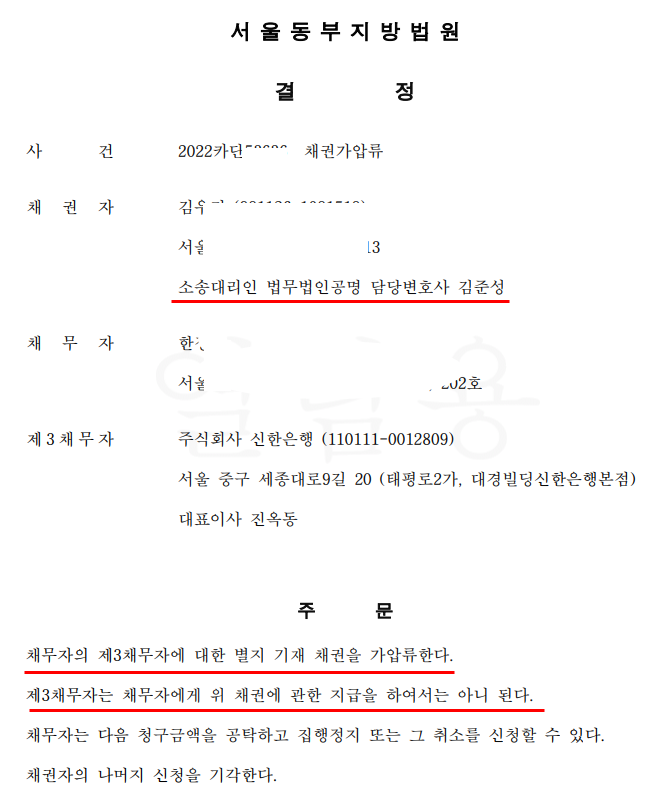 서울동부지방법원은 김준성 변호사의 위 주장을 받아들여 원고 채권가압류 신청 인용 결정을 하였습니다.