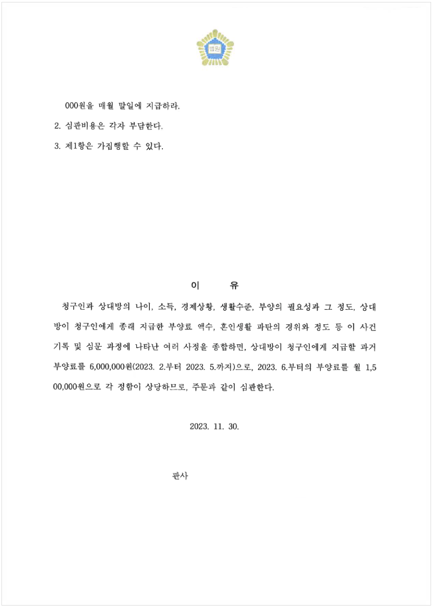 ✔ B가 집을 나간 후 A에게 지급하지 않은 과거 부양료와 ✔ 이혼 소송이 끝날 때까지 매월 150만원의 부양료를 지급하라는 결정을 하였습니다.
