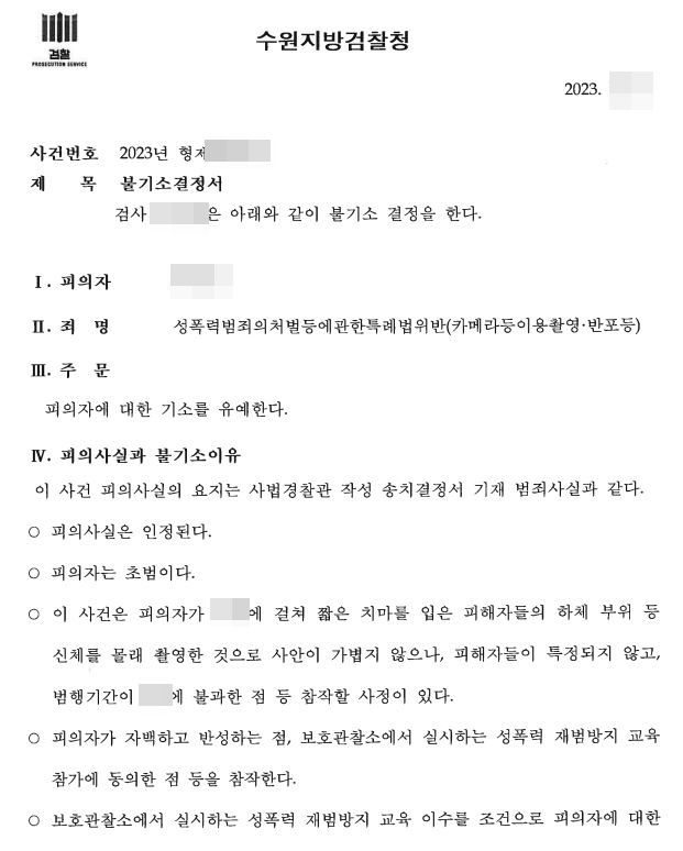 수십 건의 불법촬영 피해자들에 대한 합의를 하지 못하였음에도 교육조건부 기소유예로 종결시켜 전과를 면하게 되셨습니다.