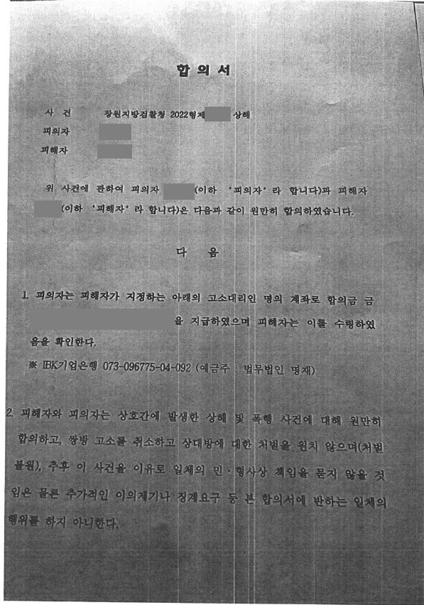 결국 수천만원의 합의금을 받는 것을 조건으로 이 사건을 합의하고 가해자에 대한 처벌불원서를 제출하였습니다(합의 내용에 따라 구체적인 액수는 밝힐 수 없음을 양해 바랍니다). 이로 인해 의뢰인은 충분한 위로금을 지급받을 수 있었으며, 가해자 또한 상해죄가 아닌 폭행죄를 적용받아 합의에 따른 공소권없음 처분을 받고 아무런 형사 처벌 없이 사건을 마무리할 수 있게 되었습니다.