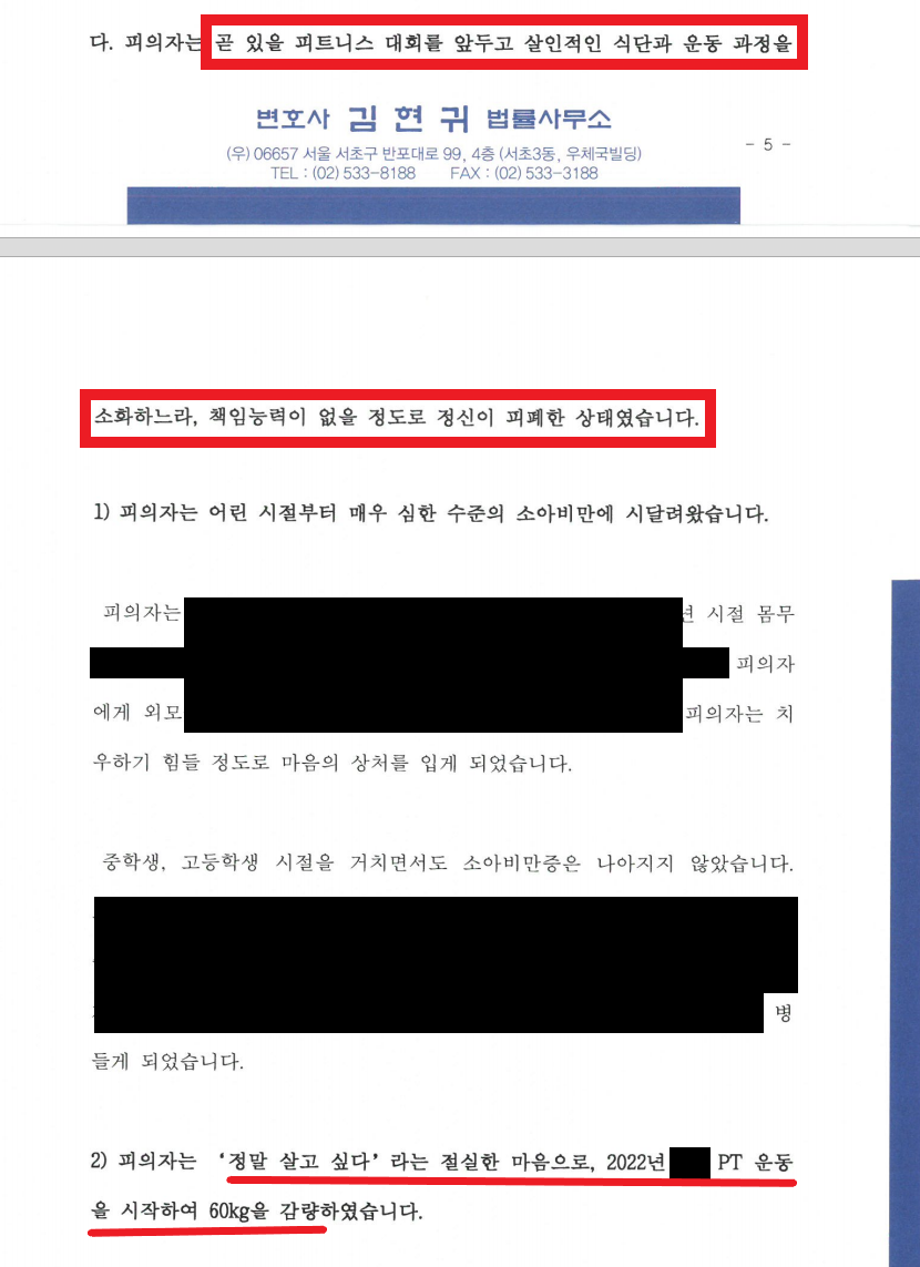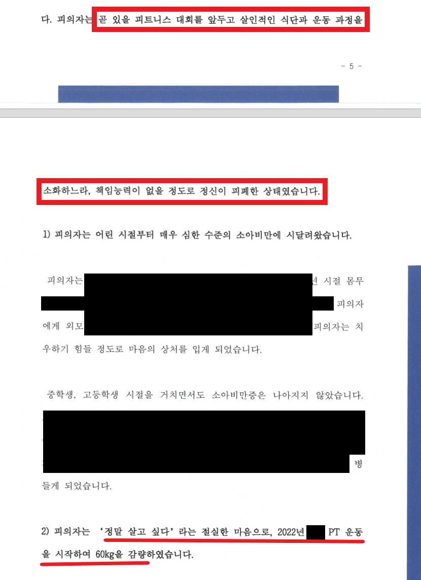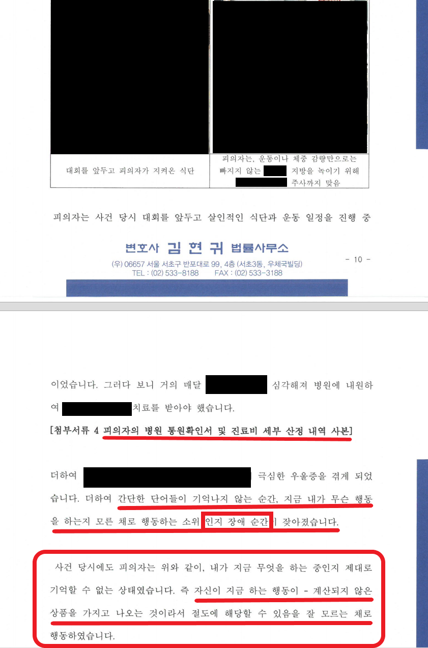 ② A는 곧 있을 피트니스 대회를 앞두고 살인적인 식단과 운동 과정을 소화하느라, 극도로 정신이 피폐한 상태에서 범행에 이름