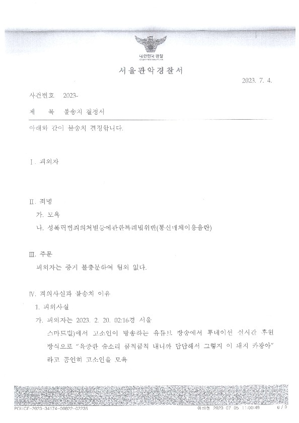 위 사건에서 피의자는 유튜브방송 투네이션으로 고소인에게 "육중한 소리 쿰척쿰척 내니까 답답해서 그렇지 이 돼지 카광아"라고 발언하여 모욕죄로 형사고소 당하였고,