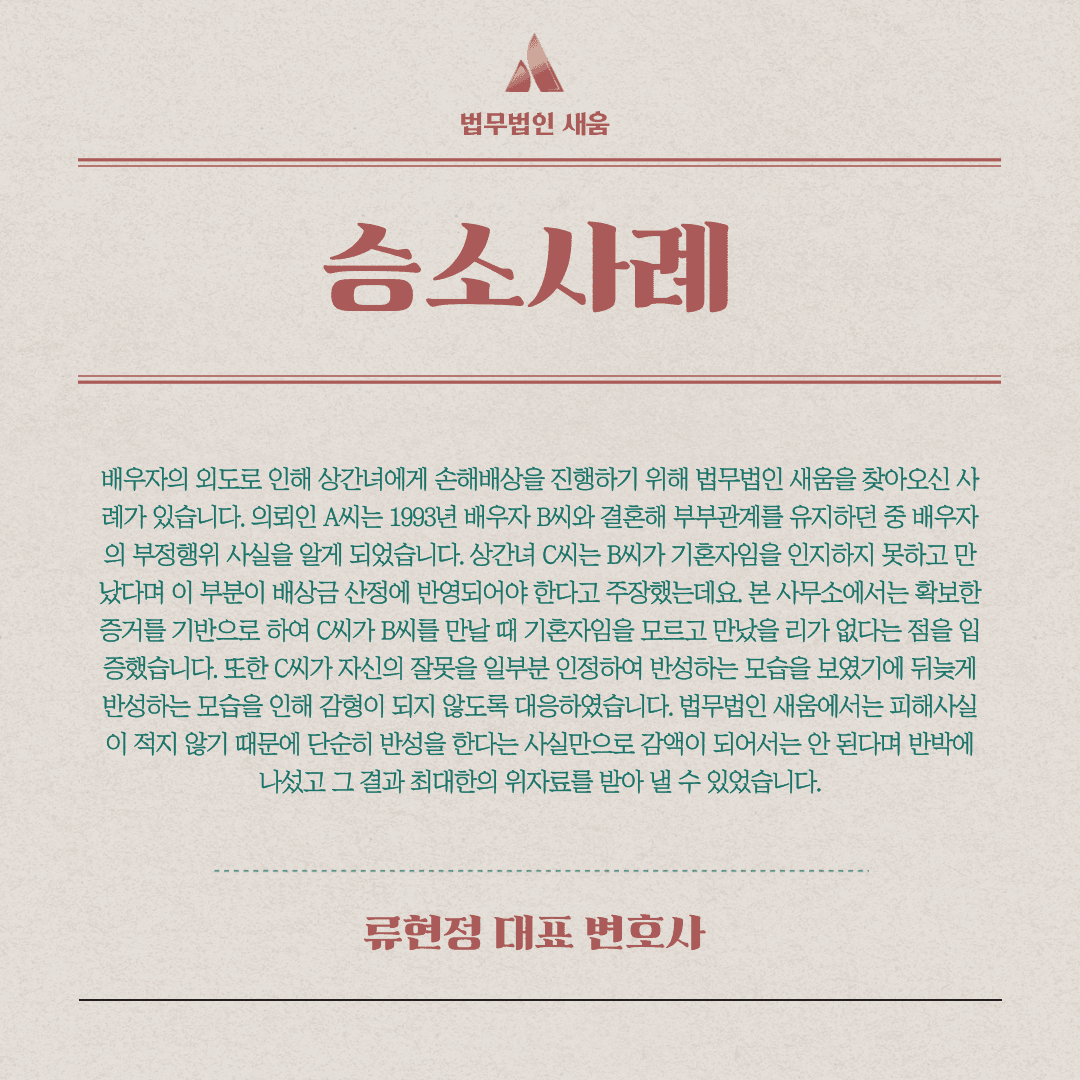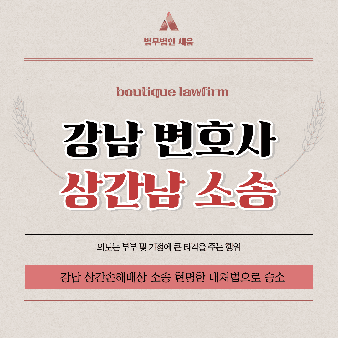 배우자의 외도로 인해 상간녀에게 손해배상을 진행하기 위해 법무법인 새움을 찾아오신 사례가 있습니다. 의뢰인 A씨는 1993년 배우자 B씨와 결혼해 부부관계를 유지하던 중 배우자의 부정행위 사실을 알게 되었습니다. 불륜은 법적으로 처벌할 근거가 없었기 때문에 의뢰인 A씨의 정신적 피해를 보상받을 수 있는 것이 유일한 대응방안이었는데요. 이에 법무법인 새움에서는 최대한 많은 손해배상금을 받을 수 있게끔 조력을 더하였습니다.