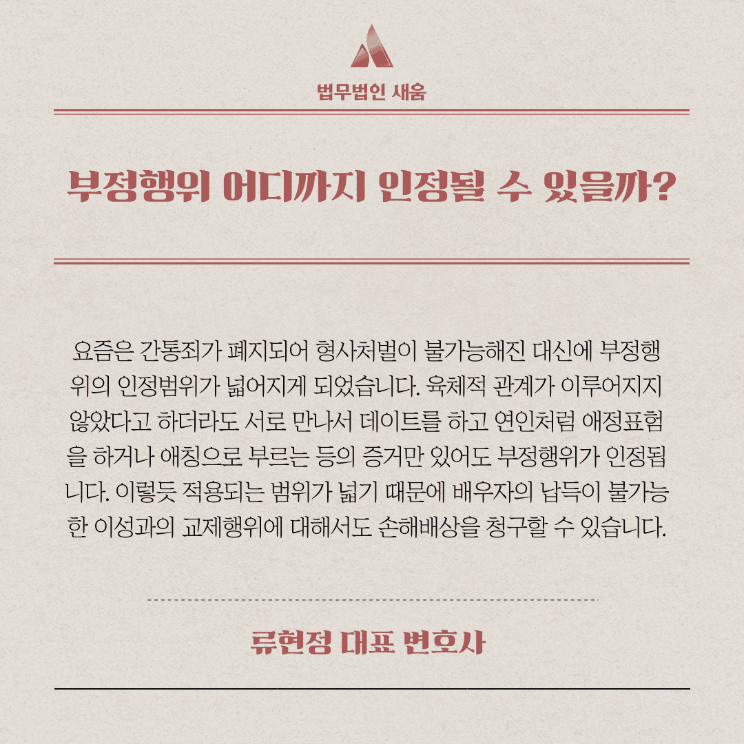 과거 간통죄가 있을 때는 두 사람이 서로 성관계를 해야만 성립이 가능했었습니다. 그렇기에 배우자가 다른 사람을 만나 데이트를 하거나 같이 여행을 간다고 해도 육체적 관계에 대한 증거가 없을 경우 법적 대응이 불가능했습니다. 요즘은 간통죄가 폐지되어 형사처벌이 불가능해진 대신에 부정행위의 인정범위가 넓어지게 되었습니다. 육체적 관계가 이루어지지 않았다고 하더라도 서로 만나서 데이트를 하고 연인처럼 애정표험을 하거나 애칭으로 부르는 등의 증거만 있어도 부정행위가 인정됩니다. 이렇듯 적용되는 범위가 넓기 때문에 배우자의 납득이 불가능한 이성과의 교제행위에 대해서도 손해배상을 청구할 수 있습니다.
