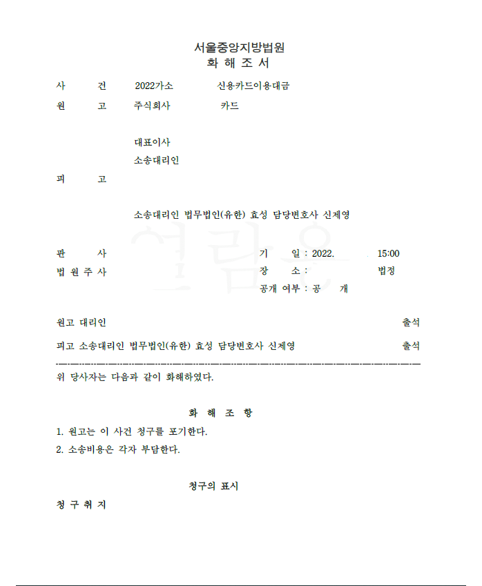 저는 즉시 응소하여 명의도용/위조 사실을 주장 입증하였고 법원은 저희의 주장을 받아들여 대출기관이 청구를 포기하는 내용의 재판상 화해를 하였습니다.